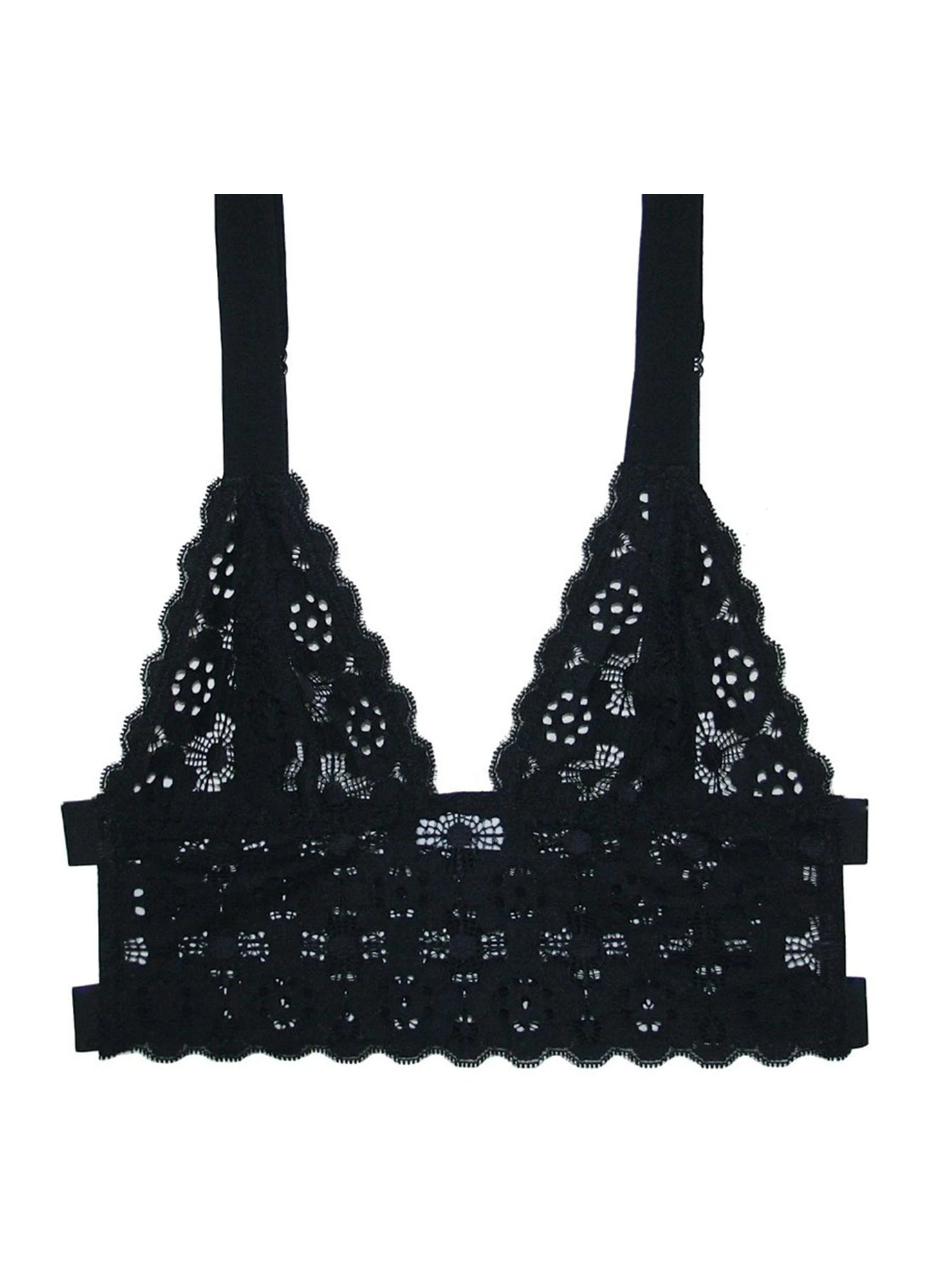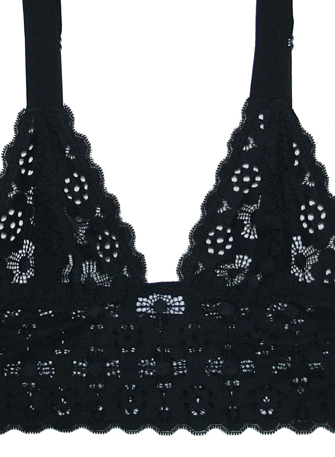 Stretch eyelet lace longline triangle bra. Plunge neckline with leather bow detail. No underwire, unpadded. Silk georgette straps & silk-covered elastic side bands. Perfect under a sheer top, or on its own with high waisted pants or skirt. Pair it with the Crochet Lace Cheeky.