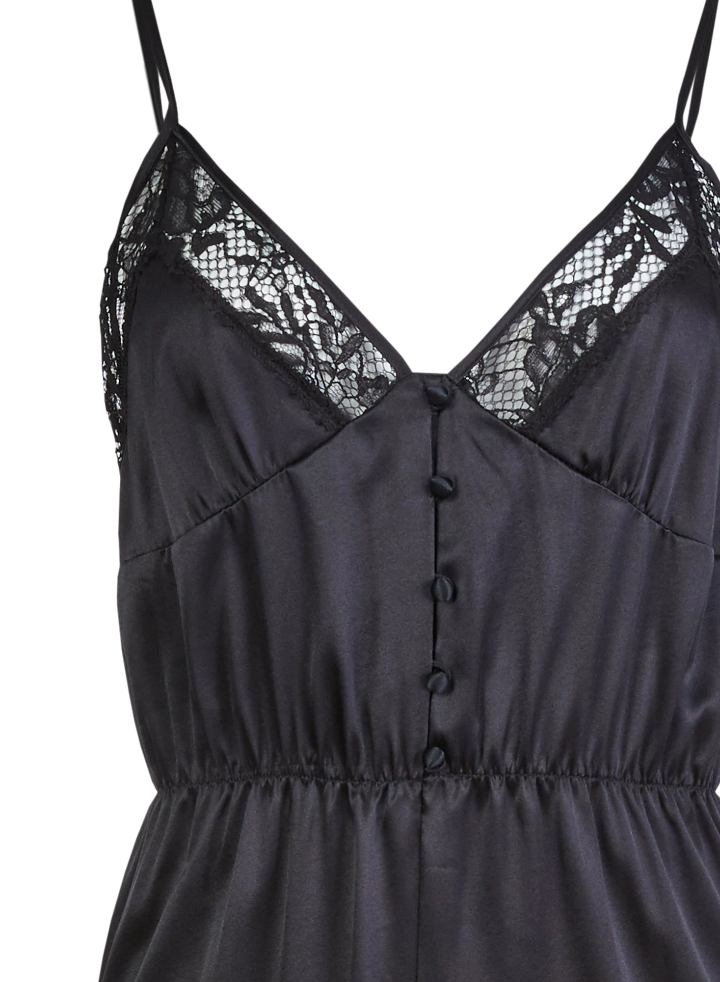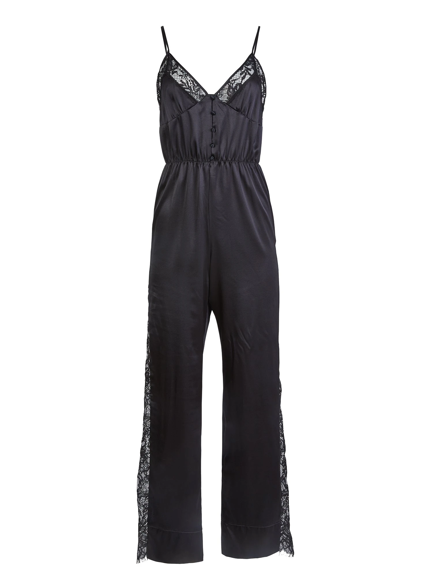 Our luxe Silk and Lace Jumpsuit features front button detailing and an elasticized waist to add shape and flatter your figure. Lace paneling on sides and neckline heats things up. Take it to the bar with your favorite Essentiels panty, or layer over a bikini for a chic poolside look.
